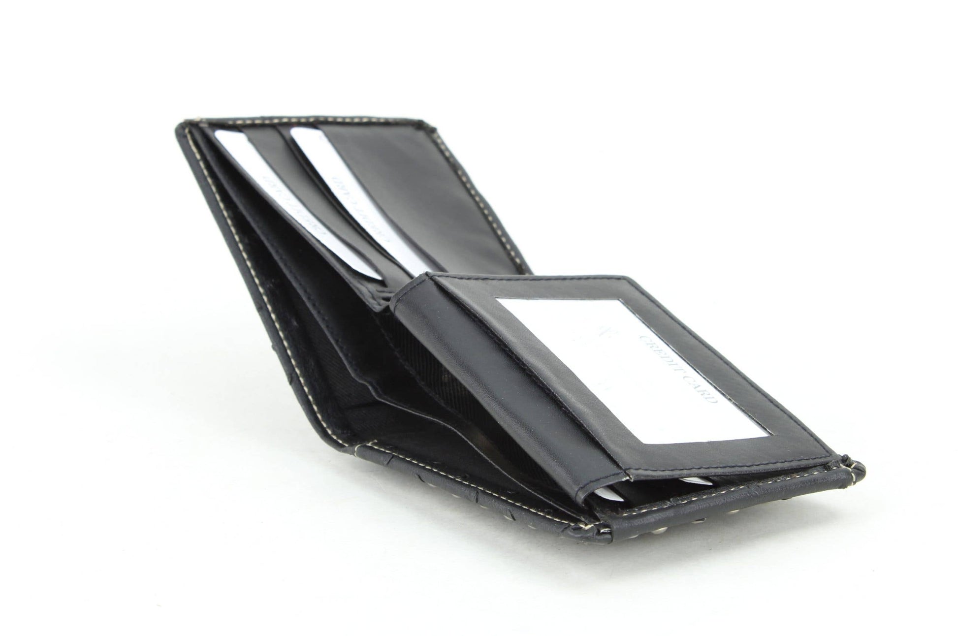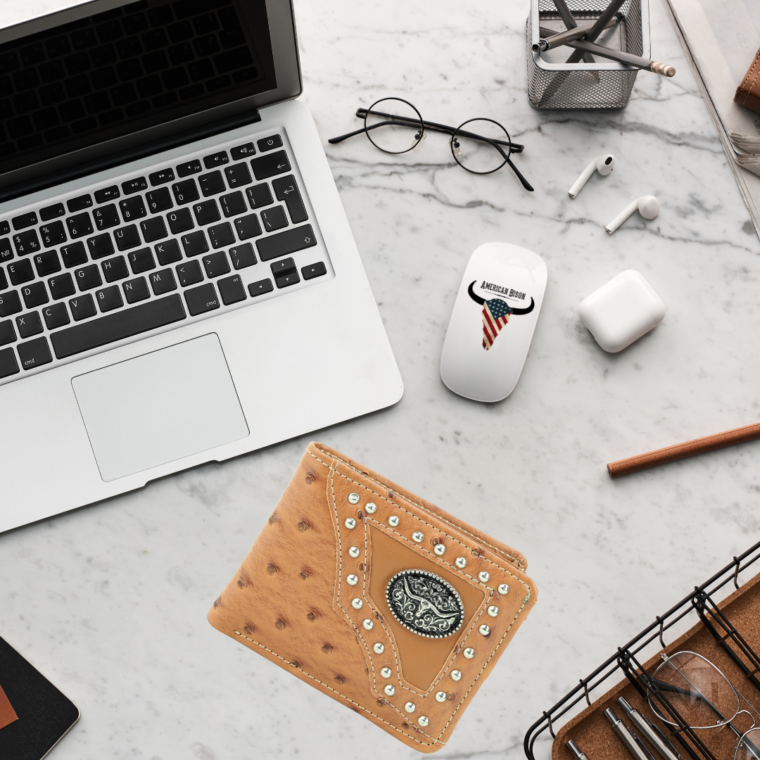 The American Bison Vegan Leather Concho Bifold Wallet with Steer Medallion is designed for practicality. Boasting six credit card slots, it accommodates a range of cards, while the flap-over ID window offers swift access to identification without the need for extensive searching. The inclusion of two interior money compartments enhances its functionality, providing organized space for both cash and essentials. This beautiful wallet comes in black, brown and tan to match any style and outfit. The matching gift box makes it the perfect gift. Stock your shop with Leather Impressions latest vegan wallet collection.